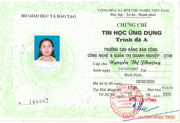 Chứng chỉ ngoại ngữ Tiếng AnhSau khi đi làm được một thời gian, tôi đã đăng ký học Đại học hệ từ xa tại Trường Đại Học Kinh Tế Đà Nẵng, quá trình học tập là 05 năm. Và mới đây, tôi đã tham gia và hoàn thành xong chứng chỉ kế toán trưởng tại trường Đại Học Kinh Tế Tp.HCM.